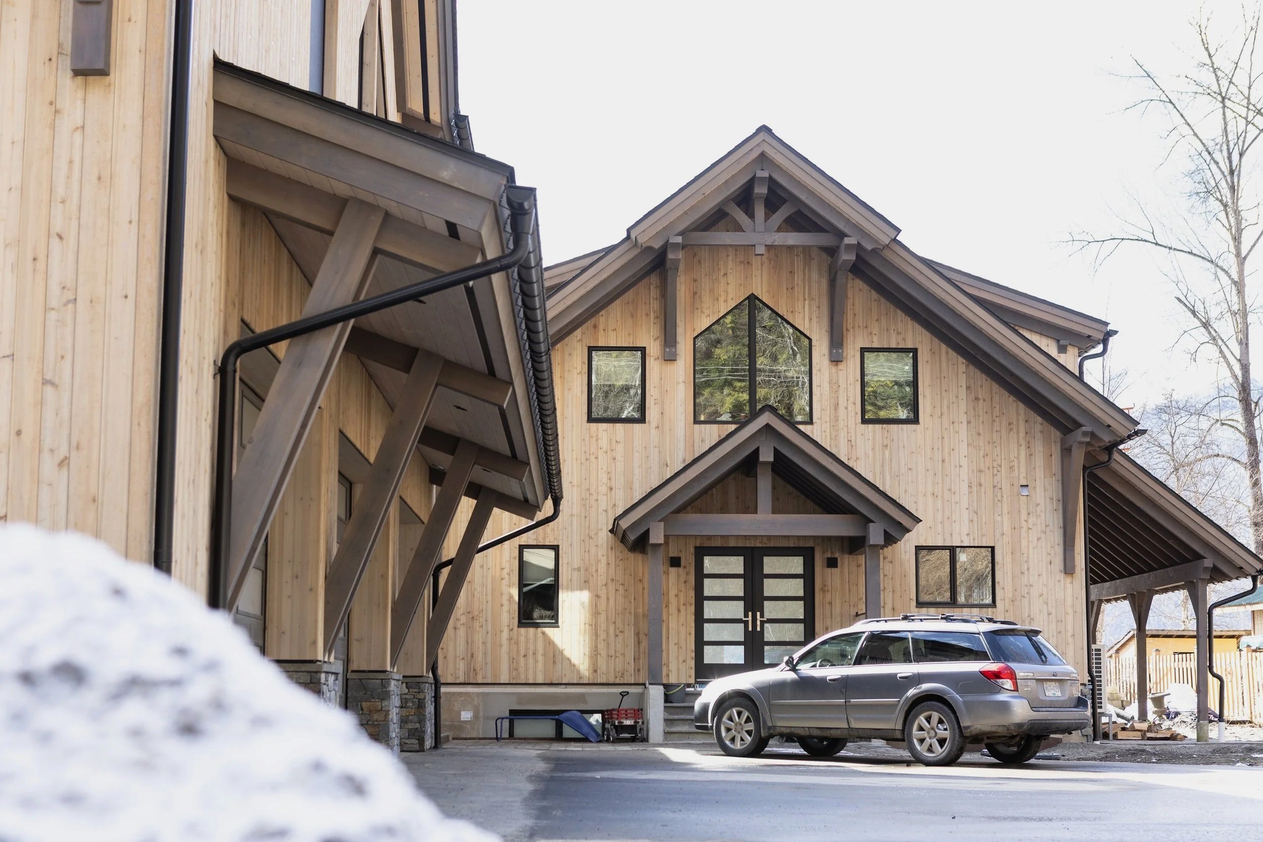 Exterior materials include cedar siding and pine soffits, set against a steel superstructure with expressed Douglas fir structural elements. Windows are oak-framed passive house units by Internorm, with an aluminium patio slider at the roof level. Interior construction incorporates solid walnut millwork fabricated by KT Creations. Environmental performance is addressed through a fully electric building system, including a heat pump and high-efficiency glazing, scaled to support year-round occupation and seasonal use.